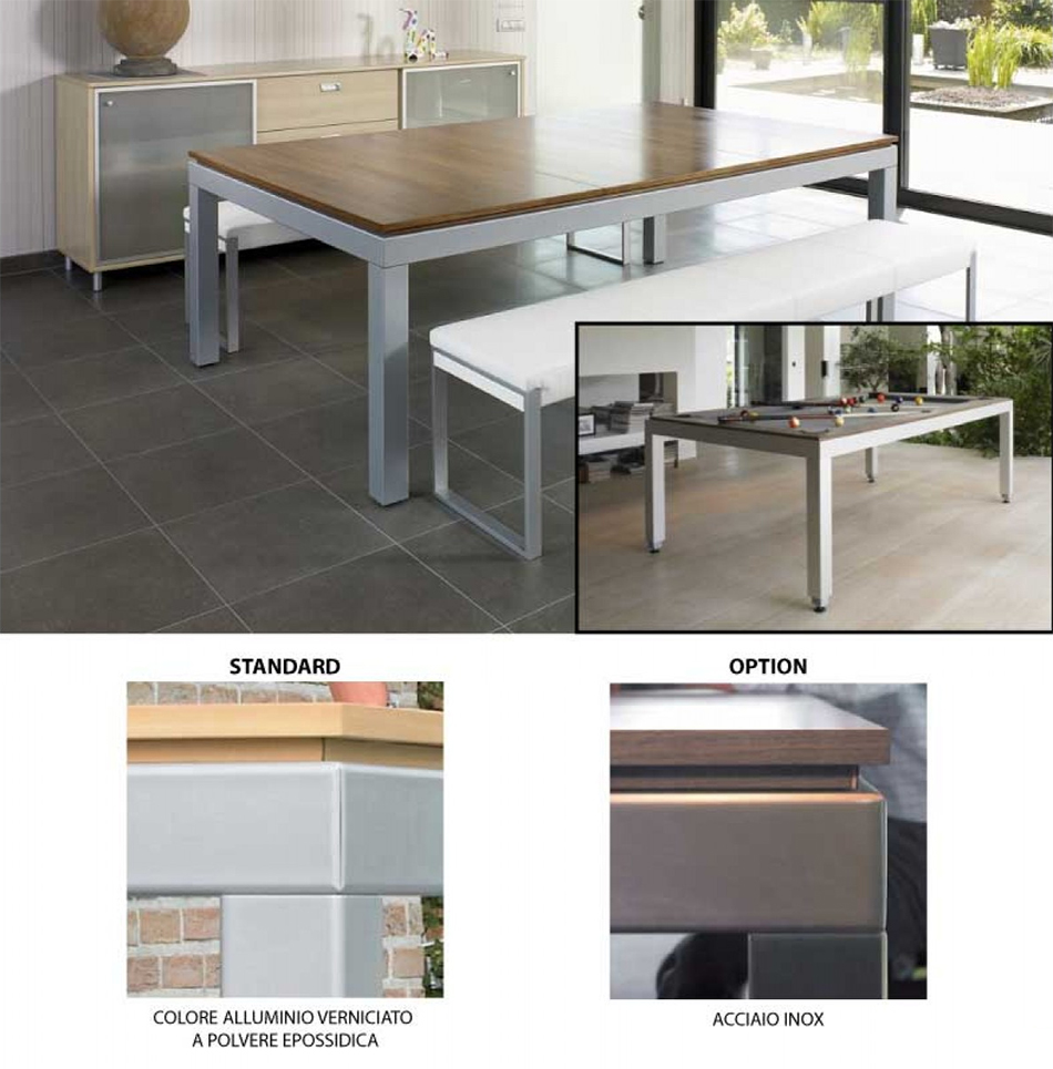 Eleganza e multifunzionalità come si evince dal suo stesso nome, il tavolo Fusion è un tavolo da pranzo dal design semplice emoderno che racchiude un vero e proprio biliardo professionale. Basta far scorrere orizzontalmente parte della superficie del tavolo da pranzo per scoprire il biliardo. Il sistema Easy Lift consente di sollevare facilmente il tavolo aggiungendo altri 75mm all'altezza standard per raggiungere l'altezza del gioco regolamentare. Il tavolo è caratterizzato da un robusto telaio in acciaio ed è prodotto usando moderni materiali di design ed una minuziosa selezione di legni impiallacciati. Viene fornito con un'ardesia naturale tagliata a precisione di 19mm. Il sistema di sponde velocity K66 assicura un eccezionale rimbalzo delle bilie. Viene fornito con apnno in filato pettinato aramith preinstallato che garantisce velocità ottimale, facile manutenzione e lunga durata.